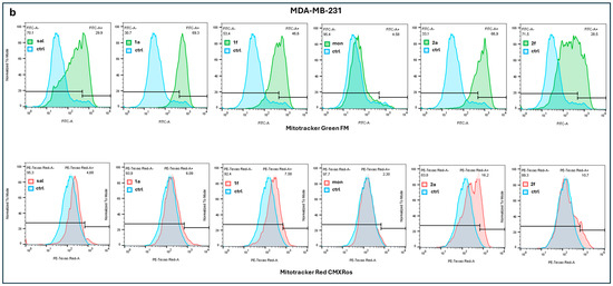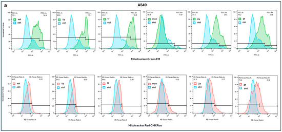 In contrast, mitochondrial function and integrity estimated by MTRed CMXRos assay revealed a slight increase in red fluorescence relative to that estimated by MTGreen in all studied cases. The highest levels of MTRed CMXRos positive stained cells were observed after treatment with doubly modified MON derivatives 2f both in A549 and MDA-MB-231 cells (22.5% and 15.5% positive cells, respectively) and after treatment with 2a in MDA-MB-231 cells (13.4% of positive cells). Notably, 2a and 2f derivatives exhibited higher red fluorescence than their SAL analogs (1a and 1f), especially doubly modified 2f for which the ratio of green and red positive stained cells was close to 1:1 in A549 cells (Figure 2 and Figure 3a,b). These findings may suggest a balanced increase in the mitochondrial mass and functional integrity.