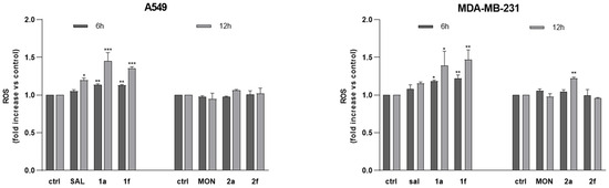 The effect of SAL, MON and their derivatives 1a, 1f, 2a and 2f on mitochondrial ROS production in A549 and MDA-MB-231 cells. The bars show the fold change in the mean fluorescent intensity as compared to the control. The cells were incubated for 6 h and 12 h with the compounds studied at their IC50 concentrations, labeled with MitoROS 580 dye and analyzed by microplate-based fluorimetry. Untreated cells were used as the control. The results are presented by means ± SD, n = 4. Statistical significance was determined at p < 0.05 (*); p < 0.01 (**) and p < 0.001 (***), by 1-way ANOVA.