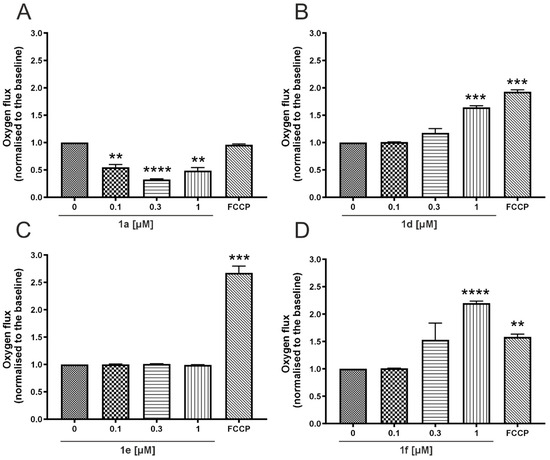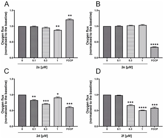Impact of MON derivatives on the oxygen consumption rate in whole non-perforated A549 cells cultured in starving DMEM (Dulbecco’s Minimal Essential Medium). Bars illustrate the effects of the tested compounds at different concentrations (0.1, 0.3 and 1 μM) on the oxygen consumption rate of A549 cells, measured using high-resolution respirometry. The compounds analyzed include MON analogs: (A) 2a, (B) 2d, (C) 2e and (D) 2f; their effects are normalized to the oxygen consumption rate recorded after stabilization, prior to any compound addition. Complete mitochondrial uncoupling was induced with 2 μM FCCP. Data are presented as mean ± SD, with n = 4. Statistical significance was assessed by one-way ANOVA, with p-values of <0.05 (*), <0.01 (**) and <0.001 (***), and p < 0.0001 (****) considered significant.