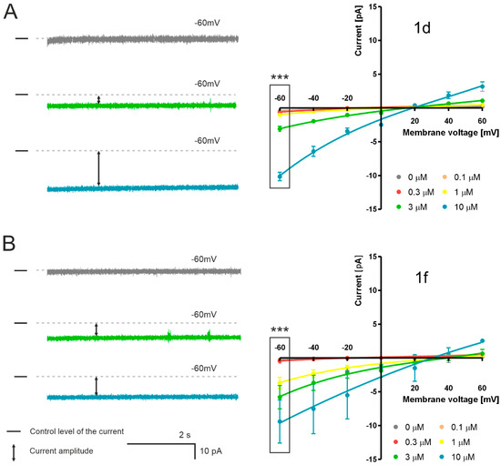 Current–time recordings and current–voltage (I–V) relationships for ionic currents across lipid bilayer membranes under a 50/150 mM KCl (cis/trans) gradient. The left panel displays representative current traces recorded at −60 mV in control conditions and in the presence of 3 or 10 μM of (A) compound 1d, (B) compound 1f. The right panel shows the corresponding current–voltage (I–V) relationships for these compounds at concentrations of 0.1, 0.3, 1, 3, and 10 μM, across a voltage range from −60 mV to +60 mV. Average current values (n = 4) and their standard deviations (SD) are plotted, with dashed lines representing baseline (control) current levels in the absence of compounds. The ↕ symbol denotes representative amplitudes of current observed in the presence of each compound. All experiments were repeated four times. Statistical significance was evaluated using one-way ANOVA, with values of p < 0.001 (***) considered highly significant.