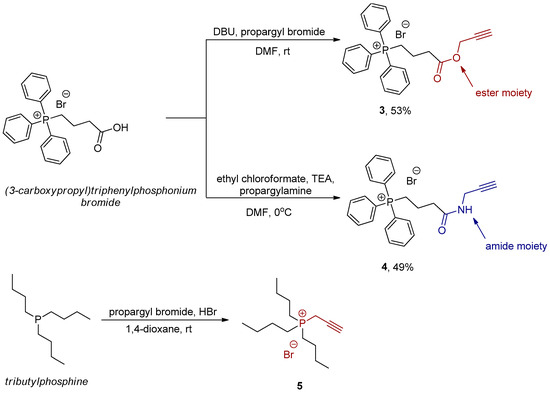 The method most commonly employed for the synthesis of 1,2,3-triazole rings is the Huisgen 1,3-dipolar cycloaddition, often referred to as “click chemistry.” This reaction utilizes organic azides and alkynes as substrates. Consequently, it was necessary to obtain suitable precursors for subsequent bioconjugation reactions. Tributylphosphine and (3-carboxypropyl)triphenylphosphonium bromide were converted into their respective propargyl derivatives (Scheme 1). Notably, the carboxylic acid functional group was transformed into the corresponding propargyl ester and amide (compounds 3 and 4), with reaction yields of approximately 50%. Tributylphosphine was converted into a propargyl phosphonium salt (compound 5); however, the product was not isolated but instead used in crude form for subsequent transformations (Scheme 1).