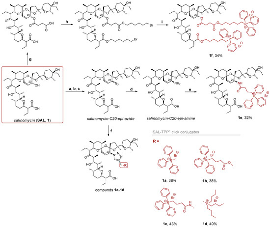 In the context of SAL derivatives, the most suitable approach to the click reaction is via the Meldal method, which utilizes CuI as a source of copper(I) ions. This strategy enabled the synthesis of triazole-linked SAL conjugates with triphenylpropargylphosphonium bromide and propargylated precursors 3, 4, or 5 (compounds 1a–1d), with reaction yields ranging from 38% to 43% (Scheme 2). In the subsequent step, the C20 azide of SAL was reduced to the corresponding amine precursor via the Staudinger reaction (Scheme 2). Given the availability of the carboxylic phosphonium salt previously used for the synthesis of propargyl precursors, it was possible to directly obtain the corresponding amide conjugate (compound 1e, Scheme 2) with the yield of 32%. Furthermore, a disubstituted SAL–TPP+ conjugate was targeted. To this end, an additional carboxylic acid moiety was introduced into the SAL scaffold via reaction with succinic anhydride (Scheme 2). Since both carboxylic acid groups exhibited similar reactivity, subsequent esterification with 1,6-dibromohexane followed by nucleophilic substitution with triphenylphosphine afforded the final disubstituted conjugate (compound 1f) in 34% yield (Scheme 2).