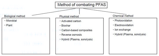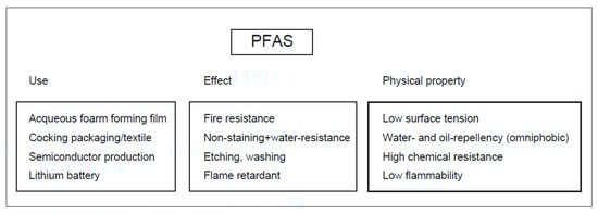 Per- and polyfluoroalkyl substances (PFAS) have been used in a wide variety of applications, such as aqueous film-forming foam (AFFF), nonstick cookware, rubber packing materials, water-repellent fabrics, food packaging, cosmetics, and pesticides [1,2,3] (Figure 1). In 1938, Teflon (R), a prototypical PFAS, was invented by DuPont. PFAS are less susceptible to chemical degradation; thus, they are called “forever chemicals.” PFAS are an anthropogenic group of chemicals that are routinely detected in many industrialized countries in almost all samples (Table 1). Before 2000, a variety of PFAS compounds were produced. After the early 2000s, some major PFAS were phased out. Specifically, perfluorooctane sulfonate (PFOS, Figure 2) was first listed in the Stockholm Convention in 2009. Subsequently, perfluorooctanic acid (PFOA) was added in 2019, followed by perfluorohexane sulfonate (PFHxS) in 2022. In 2025, many industrialized countries followed this proposal [3].