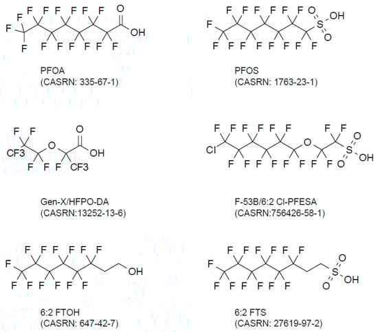 Emerging PFAS is another widely used term for newly developed PFAS compounds and their precursors/metabolites that are not included in legacy PFAS [1]. Recent evidence has demonstrated that these emerging PFAS are now widely detectable (reviewed in [28,29]) (Table 2). Emerging PFAS include Gen-X (hexafluoropropylene oxide-dimer acid, also known as HFPO-DA) and F-53B (2-((6-chloro-1,1,2,2,3,3,4,4,5,5,6,6-dodecafluorohexyl)oxy)-1,1,2,2-tetrafluoroethanesulfonic acid) [30] (Figure 2). Gen-X constitutes a common short-chain PFAS alternative, replacing PFOA, the linear long-chain PFOA representing the most common PFAS. F-53B is an alternative to the PFOS used in the industry, offering wide applications in manufacturing. These emerging PFAS usually contain, but are not limited to, an ether group [31]. 6:2 FTOH and 6:2 FTS are fluorotelomer PFAS, also classified as emerging PFAS. Based on these structures, there are also many telomer-structured emerging PFAS that might contain amide, ester, branched alkane, alkene, halogen atom, or other functional groups. In these cases, each perfluorinated compound, such as 6:2 FTOH, has a shorter carbon chain (C ≤ 6 in PFOS) [32]. Some such short-chained emerging PFAS are also called volatile PFAS; they are better quantified using gas chromatography–mass spectrometry (GC-MS) than LC-MS (Table 1). These shorter-chain PFAS accumulate in the air as the decomposition product of parental emerging PFAS by either chemical or biological pathways [2]. The biological effects of the emerging PFAS appeared to be similar [33]. The pharmacokinetics of emerging PFAS’ excretion from the human body have yet to be established.