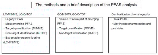 For the pretreatment of samples, particularly food, the QuEChERS (Quick, Easy, Cheap, Effective, Rugged, Safe) method is a sophisticated version of the multistep solid-phase extraction method developed by the United States Food and Drug Administration [13,14,15]. Currently, these services are commercially provided by multiple vendors. Essentially, a liquified sample was mixed with methyl tert-butyl ether, followed by the addition of MgSO4 as the desiccant. Collection of an organic layer allows a specimen to be ready for 1st solid-phase extraction, such as graphite carbon chromatography. Flow-through was collected and applied to a second solid-phase extraction, typically composed of weak anion exchange chromatography. Because most PFAS, such as PFOS and PFOA, are negatively charged at neutral pH, the elution of PFAS is achieved by an acidified solution to protonate a weak anion exchange resin. The collected eluate was then dried and concentrated when necessary, followed by an injection onto LC-MS/MS.