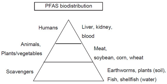 PFAS have been synthesized in almost all industrialized countries, such as the U.S., EU, Canada, Japan, Australia, China, and India. As a result, legacy PFAS have accumulated almost everywhere. Historically, PFAS had been found in soil, especially that which is close to chemical industries, as well as the places that have been previously used for airports, firefighting areas, and military areas [33] (Table 5). Water, such as river water, groundwater, and seawater, is another source of PFAS. Once PFAS accumulate in these waters, it is highly anticipated that fish and shellfish will be highly contaminated [57]. In humans, the intake of water and food is a major source of PFAS accumulation in the body (Figure 5). This leads to the regulation of PFAS concentrations in drinking water in some industrialized countries.