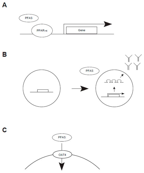 An earlier study reported that total cholesterol and LDL cholesterol were inversely correlated with PFAS concentrations, such as PFOS [110,111,112]. Such a trend might be found regardless of age and sex, raising the possibility that PFAS would modulate cholesterol accumulation in these populations in the same manner. On a molecular basis, several studies have suggested that PPAR-α may be involved in this bioprocess [81,113] (Figure 6). While an increase in cholesterol due to PFAS has been suggested in humans, a recent review concluded that PFAS accumulation appeared not to be linked to atherosclerosis [112]. While PPAR receptors accommodate a relatively wide variety of substrates, short-chained PFAS might not activate this receptor as effectively as long-chain ones do.