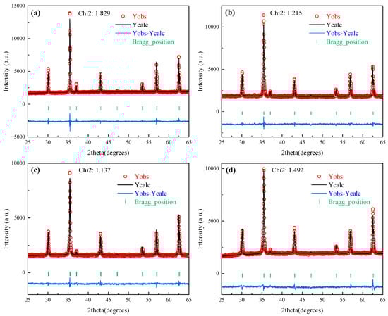 Rietveld refinement results of synthesized MgxFe3−xO4: (a) x = 0.0, (b) x = 0.2, (c) x = 0.6, (d) x = 1.0.