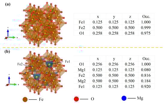 Schematic diagram and structure parameters of synthesized MgxFe3−xO4: (a) x = 0.0, (b) x = 0.6.