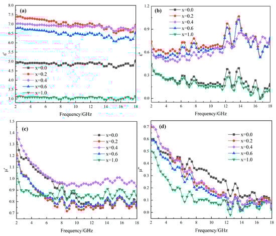 Frequency dependences of permittivity and permeability of MgxFe3−xO4: (a) real part of permittivity; (b) imaginary part of permittivity; (c) real part of permeability; (d) imaginary part of permeability.