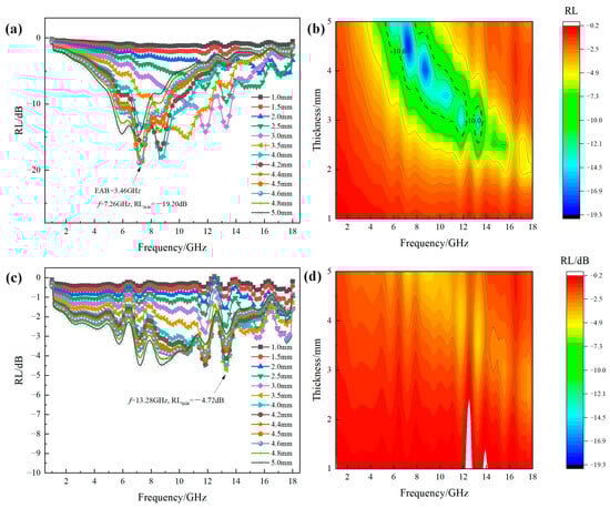 (a,c) RL-frequency curves and (b,d) 2D contour RL maps at different thicknesses of Fe3O4 and MgFe2O4 in the frequency range of 1–18 GHz: (a,b) Fe3O4; (c,d) MgFe2O4.
