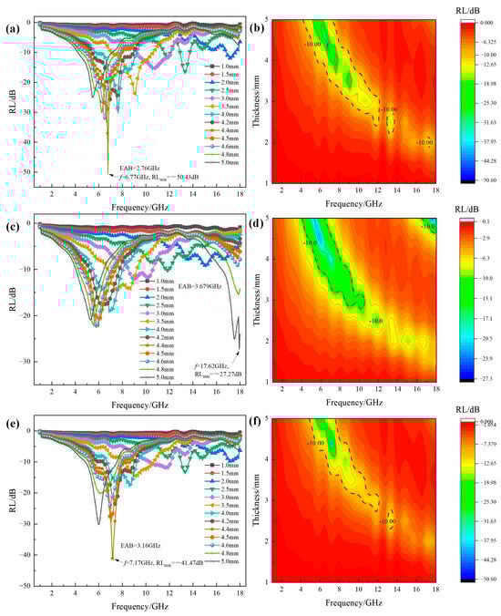 (a,c,e) RL-frequency curves and (b,d,f) 2D contour RL maps at different thicknesses of MgxFe3−xO4 solid solution: (a,b) x = 0.2; (c,d) x = 0.4; (e,f) x = 0.6.
