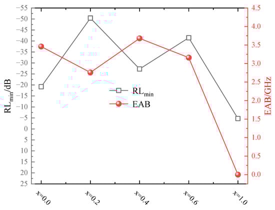 Variation curves of RLmin value and EAB range for MgxFe3−xO4.