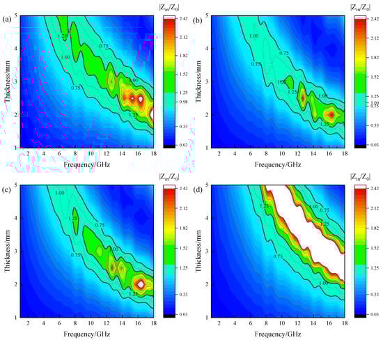 2D impedance matching plots of synthesized MgxFe3−xO4: (a) x = 0.0, (b) x = 0.2, (c) x = 0.6, (d) x = 1.0.