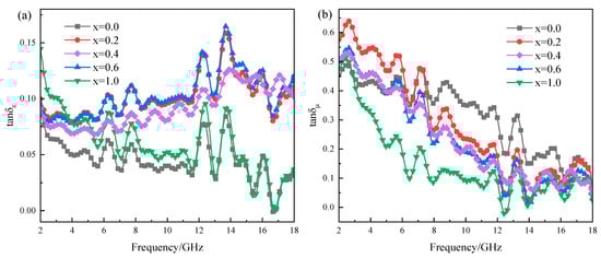 Dielectric loss tangent and magnetic loss tangent curves of MgxFe3−xO4: (a) dielectric loss tangent, (b) magnetic loss tangent.