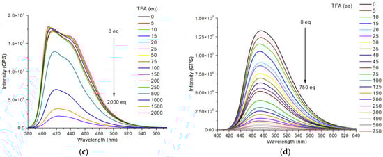 Absorption spectra changes in 6a (a) and 10 (b) in toluene (C = 2 × 10−6 M) upon gradual addition of CF3COOH (TFA). Emission spectra changes in 6a (c) and 10 (d) in toluene (C = 2 × 10−6 M) upon gradual addition of CF3COOH (TFA).