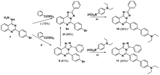 Synthesis of 2-phenyl[1,2,4]triazolo[1,5-c]quinazoline 10 and 3-phenyl[1,2,4]triazolo[4,3-c]quinazoline 11. Reagents and conditions: (i) CH3COOH, reflux, 16 h; (ii) reflux, 16 h; (iii) CH3COOH, reflux, 20 h; (iv) PdCl2(PPh3)2, PPh3, K2CO3, toluene, EtOH, H2O, argon, 85 °C, 11–16 h. * unoptimized yields.