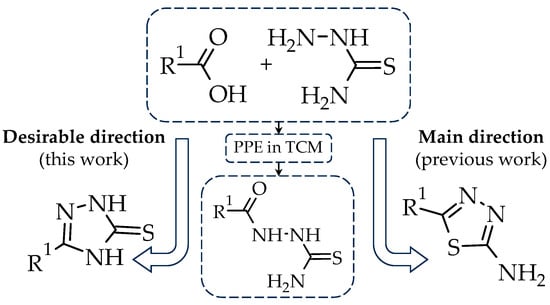 We have previously shown [] that in the presence of polyphosphate ester (PPE) the reaction of carboxylic acids with thiosemicarbazide leads to the formation of 1,3,4-thiadiazol-2-amine derivatives. Furthermore, it has been experimentally demonstrated [], that this synthesis proceeds in two stages with the formation of an intermediate acylation product (Figure 3, main direction), which is a compound that could also be utilized for the synthesis of 1,2,4-triazole-3-thiols. However, how to realize the potential of PPE for the synthesis of the target triazoles remained unclear until now. Therefore, the present study was aimed at finding optimal conditions to shift the course of the reaction between carboxylic acids and thiosemicarbazide in the presence of PPE towards the formation of 1,2,4-triazole-3-thiols (Figure 3).