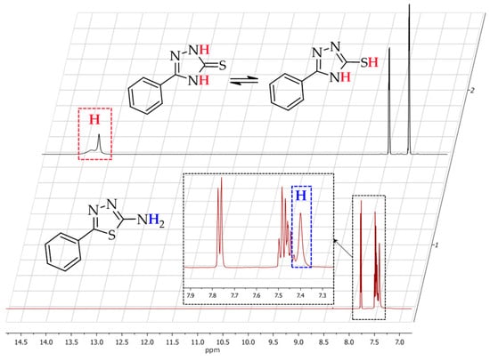 Given the aforementioned problem of thiadiazole formation as a competitive product, it is also important to discuss the spectral distinctions between 1,2,4-triazole-3-thiol derivatives and their functional isomers, 1,3,4-thiadiazol-2-amines. Figure 4 shows a comparison of the 1H NMR spectra of 5-phenyl-4H-1,2,4-triazole-3-thiol and 5-phenyl-1,3,4-thiadiazol-2-amine. A significant difference is evident (Figure 4) in the chemical shift regions for the protons of the triazole and thiadiazole rings. Specifically, the N-H and S-H protons of the triazole resonate at a much lower field (13–14 ppm) compared to the amino group signal of the thiadiazole, which appears in the aromatic region (Figure 4). Thus, it is clear that 1H NMR spectroscopy alone is sufficient for the reliable structural identification of the isolated products.