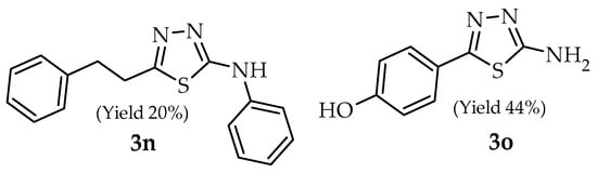 Table 3 presents the results obtained from the implementation of Scheme 2. It can be seen (Table 3) that the yield values are not high; however, it is necessary to consider that these data are calculated for individually isolated compounds after a two-step synthesis. But the most important point to emphasize is the discovered difference between syntheses 2a–h and 2i–m. In the first case (2a–h), the reaction in the hydrothermal reactor resulted in the formation of an easily separable precipitate of the intermediate, whereas in the case of carboxylic acids with nitrogen-containing heterocycles (2i–m), a resin-like mass was formed instead of a precipitate. It is quite probable that in the case of 2i–m, we observed the formation of a polymeric salt between the quaternized nitrogen of the intermediate (acylated thiosemicarbazide) and the generated residues of polyphosphoric acid.