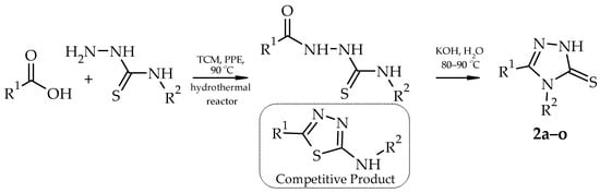 Considering the features listed above, it was decided to carry out the reaction of carboxylic acids with thiosemicarbazides in two immediate steps (Scheme 2), using a hydrothermal reaction vessel for the first stage. As shown in Scheme 2, the acylation of thiosemicarbazide may form a thiadiazole side product, aligning with the main reaction pathway in the presence of PPE (Figure 3). The two-step method capitalizes on the insolubility of the resulting 1,3,4-thiadiazol-2-amines in alkaline medium to easily separate them from the target 1,2,4-triazole-3-thiols in the second stage. This bypasses the need for intermediate isolation, greatly streamlining the synthesis. The use of a hydrothermal reactor allowed for an increase in the reaction temperature without changing the solvent and accelerated the precipitation of the acylation product from the reaction mixture.