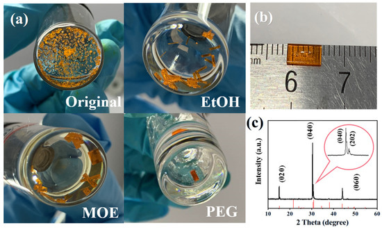 First, DMSO has been selected as the solvent of ITC-grown CsPbBr3 SCs. The molar ratio of CsBr and PbBr2 has been fixed to 1:2 to avoid Cs4PbBr6 by-product formation [33]. Shown in Figure 1a, although the seed-assisted method has been used, we receive a vast number of tiny crystals after the evaporation of the solvent. While large-sized crystals can be obtained from the additive-regulated ITC solutions. It seems that the alcohol-based additives can, to a great extent, suppress the problem of blast nucleation during CsPbBr3 SC growth. The PEG additive turns out to be the most effective, resulting in large-sized single crystals. The concentration of the PEG additive has also been investigated in detail (Figure S1). Although both contribute to large crystals, the surface of 0.05 g PEG-regulated SCs shows visible pits, so 0.1 g of additive has been used in our follow-up studies. Using PEG as additive, we receive a maximum-sized CsPbBr3 SC with a length of 6 mm (Figure 1b). More photographs of the as-synthesized crystals are summarized in Figure S2.