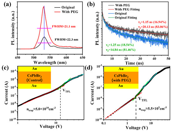 (a) Steady—state photoluminescence (PL) and (b) transient PL (TRPL) spectrum of the control and PEG—regulated CsPbBr3 SCs. Current—voltage (J—V) characteristics of the control (c) and PEG—regulated (d) CsPbBr3 SCs.