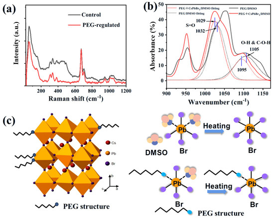 (a) Raman spectrum of the control and PEG—regulated CsPbBr3 precursor solution. The signal has been normalized according to the peak located at ~700 cm−1 (Pb-Br interaction). (b) Fourier transform infrared spectrometer (FTIR) analysis of the PEG dissolved in DMSO and PEG with CsPbBr3 DMSO solution. (c) Graphical illustration of the PEG-regulated CsPbBr3 SC growth.