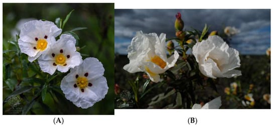Cistus ladanifer is a perennial and woody shrub that can form dense populations mostly integrating poor siliceous and acidic soils that are formed of sandstone, granite, or shale [8]. There are two varieties of Cistus ladanifer subsp. ladanifer: var. maculatus, which has a red to maroon blotch at the base of each petal (Figure 1A), and var. albiflorus, which has five petals that may be completely white (Figure 1B). These two varieties may coexist in populations that are mixed or can occur separated in monomorphic populations [3].