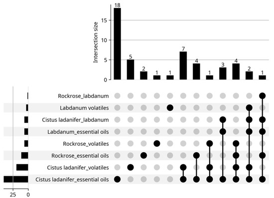 The present work provides a brief review of the volatiles extracted from Cistus ladanifer as well as their properties and applications. The information in this review was taken from articles found on the Web of Science (WOS) platform, using the keywords “Cistus ladanifer essential oils”, “Cistus ladanifer volatiles”, “Rockrose essential oils”, “Rockrose volatiles”, “Labdanum essential oils”, “Labdanum volatiles”, up to 31 May 2025. A total of 211 results were obtained, distributed by the eight keywords (sections) as can be seen in the bottom left corner of Figure 2 (sum of all data). However, some articles appeared in several sections as depicted in the same Figure. In fact, instead of 211 articles, only 127 articles were really found (sum of all data over bars). For example, there is an article that appeared in all sections; it was a review article. After reading the articles, only 49 (Figure 3) addressed essential oils (46) or emission of volatiles (3 articles). Six of the forty-nine articles lacked the chemical composition of the essential oils. The biological properties of the rockrose EOs were the primary focus of these articles. The articles may appear in multiple sections, as expected, and the review is performed with the information provided by these articles (Figure 3).