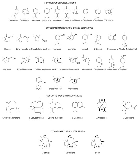 Essential oils (EOs) are composed of a wide variety of volatile compounds, including terpenes with regular carbon skeletons such as monoterpenes (C10), sesquiterpenes (C15), and diterpenes (C20) [23,24]. Terpenoids with irregular carbon skeletons, such as homoterpenes and norisoprenoids, also contribute to EO composition [23]. Phenolics derived from shikimic pathways can also be constituents of EOs such as methyl salicylate, which is the major component of wintergreen, or anethole in anise and fennel [23].