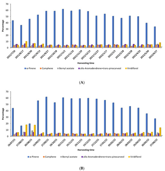Chaloupková et al. [54] studied the variation in yield and chemical composition of C. ladanifer EOs obtained from two locations in central Spain over one year and obtained from steam distillation. The age of plants was also different in those two zones. The oil yield ranged from 0.03 to 0.19% (weight/dry weight), being higher during the autumn and early winter months. Regarding the chemical composition, the authors [54] observed that a variation also occurred over time in both samples. The pattern of the main compounds (>4.5%) is depicted in Figure 5A (7-year-old plants from Bustares) and 5B (12-year-old plants from Hiendelaencina).