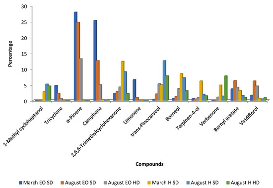 Essential oils obtained from C. ladanifer waste materials in Beira Baixa (Portugal) during March and August revealed notable seasonal differences in composition: α-pinene levels were higher in March, whereas viridiflorol was more abundant in August (Figure 6) [42]. This finding is somehow similar to that observed in samples from Spain, using the same extraction procedure (steam distillation for 1 h in samples from Spain and 1 h 30 min in Portugal). It seems that α-pinene is preferentially biosynthesized in March (winter/spring) and viridiflorol in August (summer). Figure 6 also depicts that monoterpene hydrocarbons (tricyclene, α-pinene, camphene, and limonene) decreased from March to August, in contrast to viridiflorol, bornyl acetate, trans-pinocarveol, and borneol, as well as the ketone 2,2,6-trimethylcyclohexanone (Figure 6). In the same work, these authors also compared the chemical composition of the EOs obtained by steam distillation and hydro-distillation, and the results are presented in Figure 6. The EOs obtained by hydro-distillation had less amounts of α-pinene, camphene, limonene, bornyl acetate, and viridiflorol, and higher concentrations of trans-pinocarveol, borneol, verbenone, terpinen-4-ol, and 2,2,6-trimethylcyclohexanone than those oils obtained by steam distillation (Figure 6). These differences can be the result of two factors: type of extraction and extraction time because in the hydro-distillation the time of extraction was 3 h in contrast to 1 h or 1 h 30 min in steam distillation [42,54].