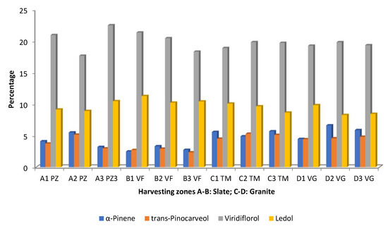 The effects of collection zone considering the edaphic substrate, and the intra-population variability were studied by Pérez-Izquierdo et al. [53]. The results are summarized in Figure 7, in which only the compounds present at >4.5% are represented. Viridiflorol and ledol were the predominant compounds. The variability in the amounts of viridiflorol is higher in the populations growing in slate substrates because it is possible to have samples with the highest percentage (A3 PZ) and the lowest percentage (A2 PZ) (Figure 7). In this case, there is also intra-population variability. The granite substrate does not exhibit this diversity as much (Figure 7). The populations B1–B3 had higher percentages of ledol in a consistent form, while the remaining samples showed variations between the populations and substrates. The EOs isolated from the populations A3 and B1–B3 had the lowest amounts α-pinene and trans-pinocarveol (Figure 7). All samples of the granite substrates along with the samples A1 and A2 had the highest percentages of those compounds. Once more, compared with plants growing in substrate slate, the EO samples taken from plants growing in granite substrate were more uniform (Figure 7).