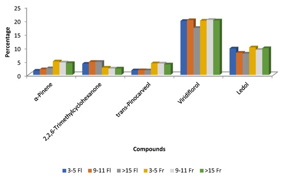 In two studies, Pérez-Izquierdo and co-authors examined the impact of the phenological stage on the chemical composition of C. ladanifer EOs from northwest Extremadura. In the first study, viridiflorol and ledol were more prevalent in August (20.38% and 8.92%, respectively) than in October (15.97% and 7.26%), whereas α-pinene was greater in October (12.91%) than in August (3.38%) [56]. In the second study, EOs from plants harvested in May (flowering phase) and August (fruit maturation) at several ages (3–5, 9–11, and >15 years) were assessed. Viridiflorol and ledol levels were lower in EOs from plants older than 15 years during flowering than in those during the fruit maturation stage. During the fruit maturity period, there was a decrease in 2,2,6-trimethylcyclohexanone and an increase in trans-pinocarveol and α-pinene (Figure 8) [55]. Regarding EO yields, C. ladanifer EO yield values ranged from 0.11 to 0.42 mL/100 g of dry plant material. The average EO yield of plants harvested at the flowering phenological stage was substantially lower (0.17%) than that of plants picked at fruit maturation (0.27%). Moreover, plants between the ages of three and five produced noticeably less than those between the ages of 9 and 11 at the flowering stage. However, no significant differences in EO yield were observed for the three age ranges studied at the fruit maturation stage [55].