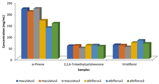 Robles et al. [25] examined the chemical composition of the two C. ladanifer varieties (maculatus and albiflorus) in three locations within the Massif de l’Estérel (south of France) (Figure 10). Only concentrations higher than 50 mg/mL were considered in this Figure, and only three compounds (viridiflorol, 2,2,6-trimethylcyclohexanone, and α-pinene) had concentrations above 50 mg/mL. The main component in all samples was α-pinene; nevertheless, the variety albiflorus had lower amounts than the variety of maculatus. The trend of viridiflorol was the opposite of that of α-pinene (Figure 10). The inverse correlation between α-pinene and viridiflorol, Figure 11, was also observed in the previous works [24,54].