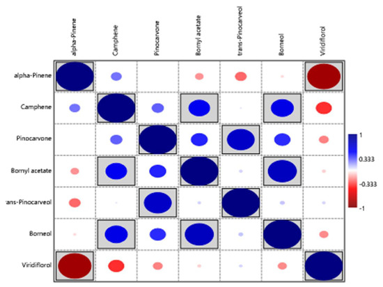 Correlation between the main compounds (>50 mg/mL) of C. ladanifer EOs isolated from the var. maculatus and var. albiflorus in their locations within the Massif de l’Estérel (south of France) [24,54]. Grey background indicates that differences are significant (p < 0.05)