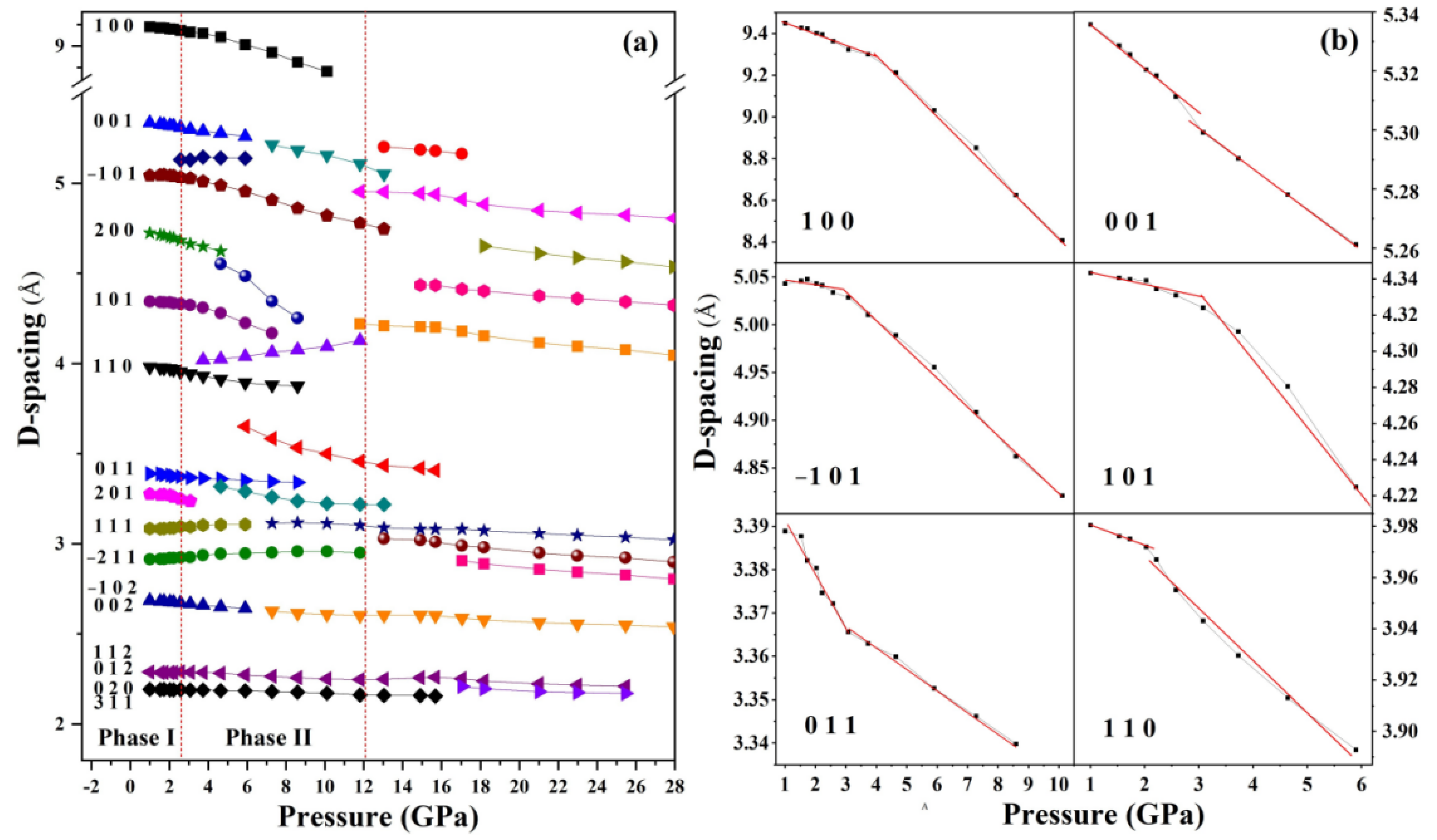 Figure 3, the structural phase transition is marked by the gradual attenuation of characteristic Phase I peaks, the emergence of new diffraction features, and subtle shifts in peak positions. This newly formed Phase II. A notable feature of this transition is that several diffraction peaks of Phase I were retained in the patterns of Phase II, suggesting a degree of structural continuity between the two phases rather than a complete breakdown and reconstruction of the crystal lattice. Nevertheless, a significant alteration in compressibility is evidenced by the substantially changed slopes of the d-spacing versus pressure curves for these retained peaks after the phase transition, reflecting different mechanical responses of the corresponding lattice planes in Phase II. This change in compressibility is a direct consequence of the structural adjustments that occur during the transition. In addition, almost all the new diffraction peaks of Phase II (labeled with pluses (+) in