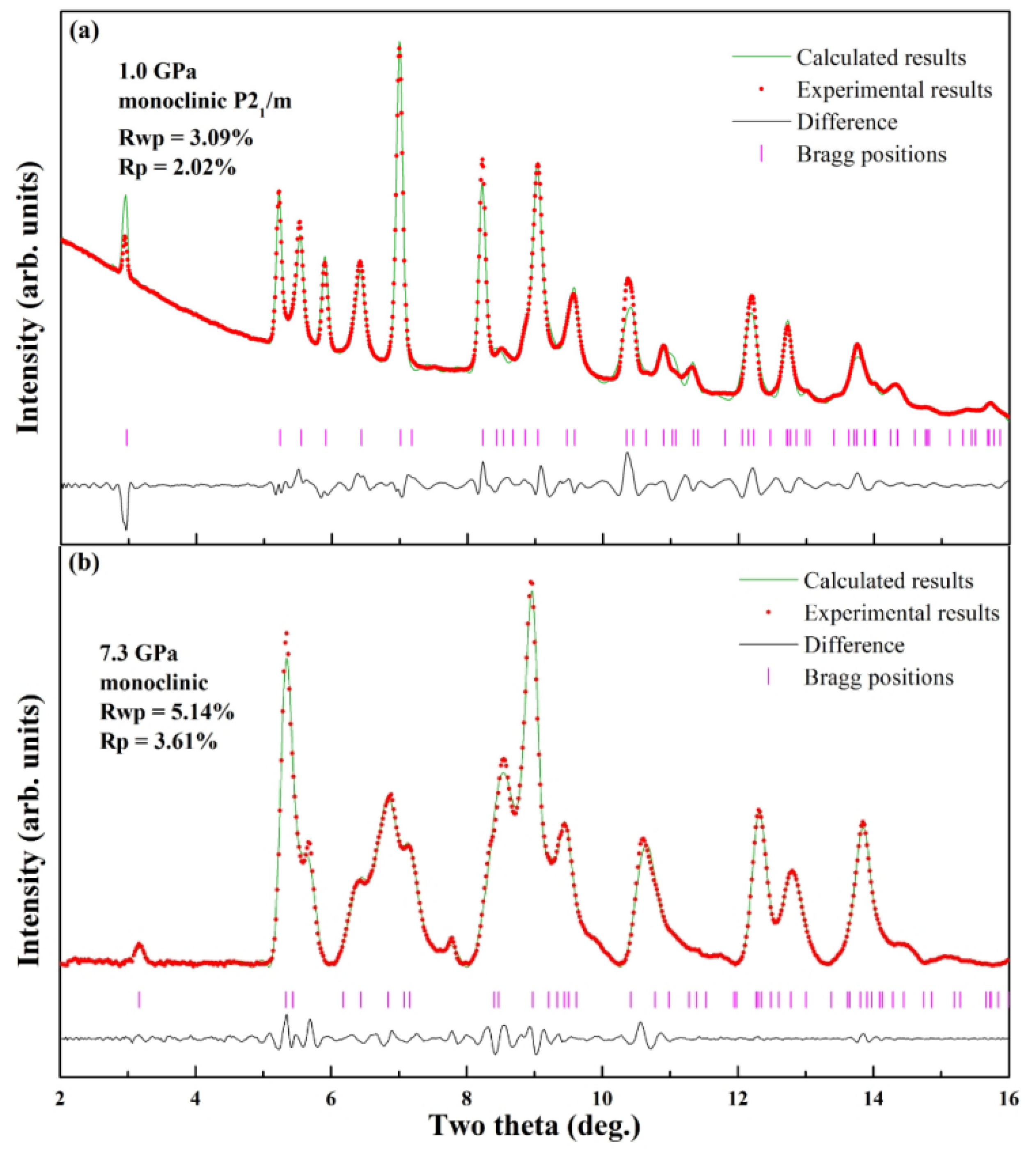 Figure 4. At 1.0 GPa, which lies within the stability field of the ambient-pressure phase (Phase I), Rietveld refinement was successfully applied. All diffraction peaks were fully resolved and indexed without unassigned signals, confirming the anhydrous sample’s high crystallinity and absence of secondary phases (e.g., hydrates or decomposition products). The refined structure conformed to a monoclinic system with space group P2