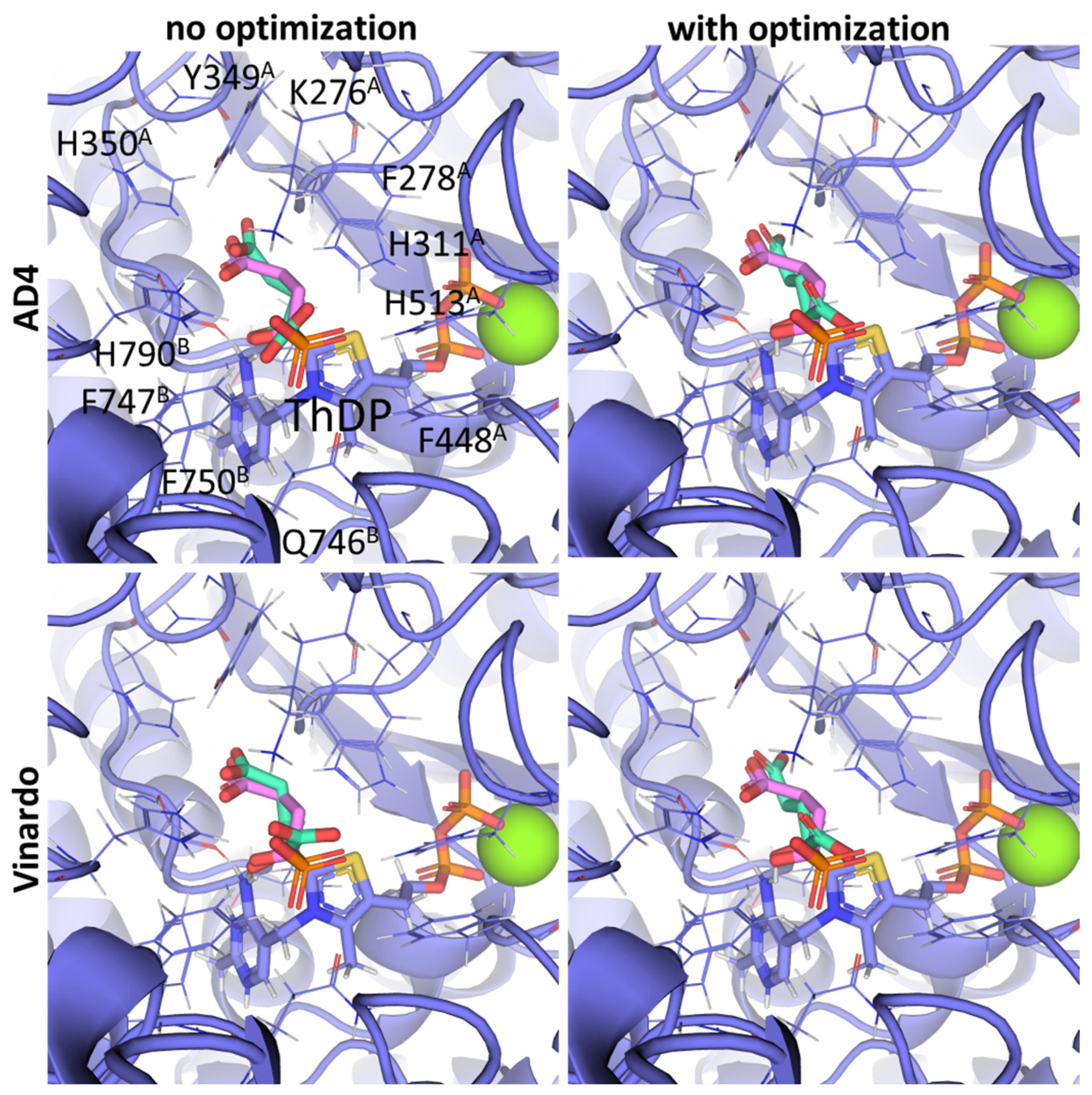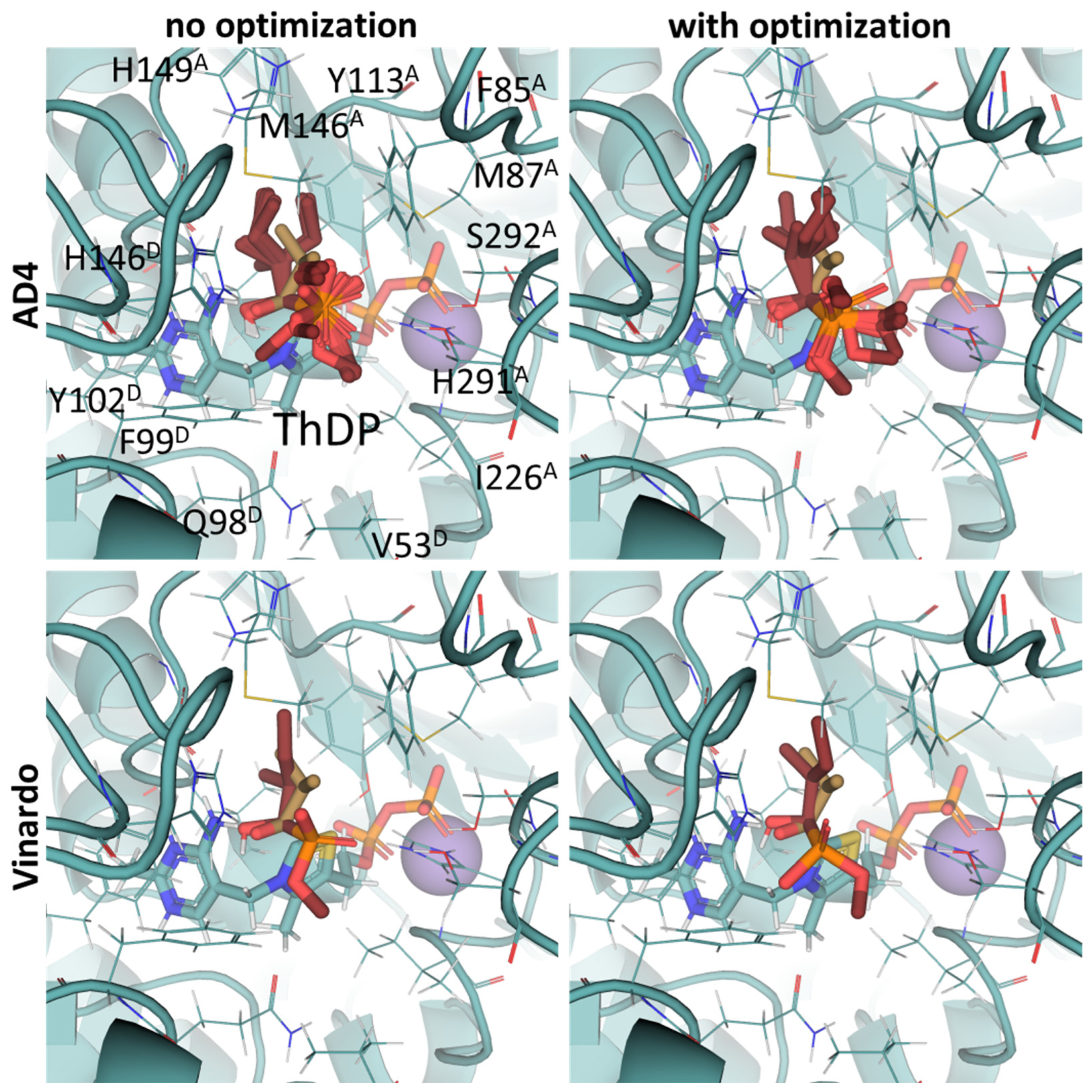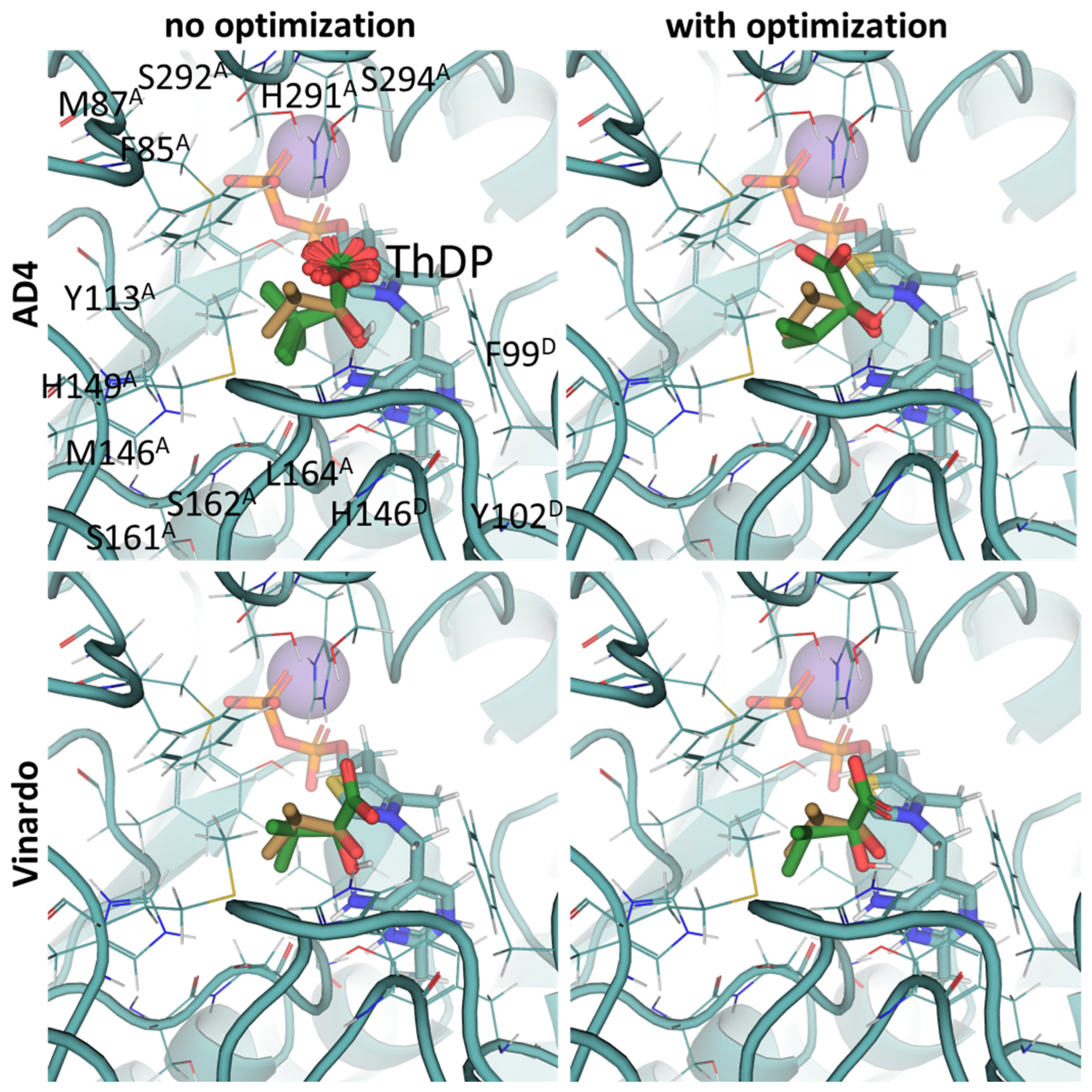 - when flexible side chain setup is used, only residues within 5.5 Å from an initially bound template were chosen (--flexdist 5.5); in that case ThDP itself is not considered as flexible residue. Note, this can be changed via exact specification of flexible residues (--flexres A:61,A:63,A:89,A:124,A:138,A:200,A:263,A:264,D:37,D:81,D:85,D:128,E:401);