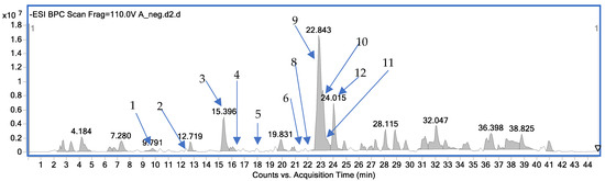 Figure 1 illustrates the chromatogram recorded in the negative mode of the LC-MS analysis of the A. officinarum extract, detailing the composition of low-molecular-weight components (m/z range 100–1000 Da). The chromatogram displays several prominent peaks, each corresponding to specific bioactive compounds present in the extract.