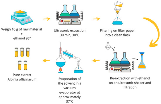 The extract was prepared following a previously described procedure [29,59]. The powdered root of Alpinia officinarum was precisely weighed to an initial mass of 80.328 g and divided into eight conical flasks, each containing 10 g of raw material. Subsequently, 50 mL of 96% ethanol (v/v) was added to each flask, ensuring complete immersion of the raw material. The flasks were then placed in an Ultrasound Efficiency Emmi 55HC-Q ultrasonic shaker (EMAG Technologies, Mörfelden-Walldorf, Germany), where extraction was conducted for 30 min at a temperature of 30 °C.