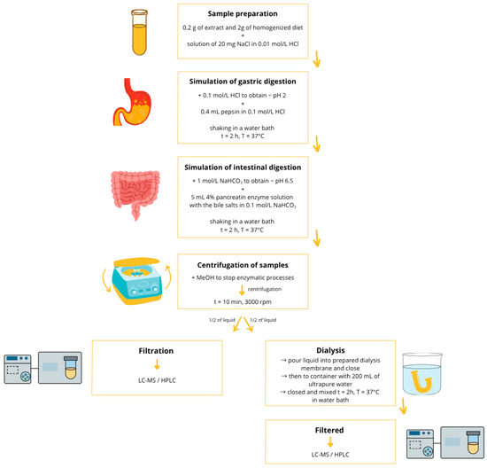 Ultrapure water was added to the samples instead of the diets for the control tests. In addition, enzymatic control tests were performed without extract and without dietary models. The remaining steps of the procedure and the reagents used were identical to those in the test samples. All determinations were performed in triplicate. The method for model digestion and bioaccessibility determination was developed and optimized in previous works [30,60]. The entire in vitro digestion protocol is shown in Figure 3.