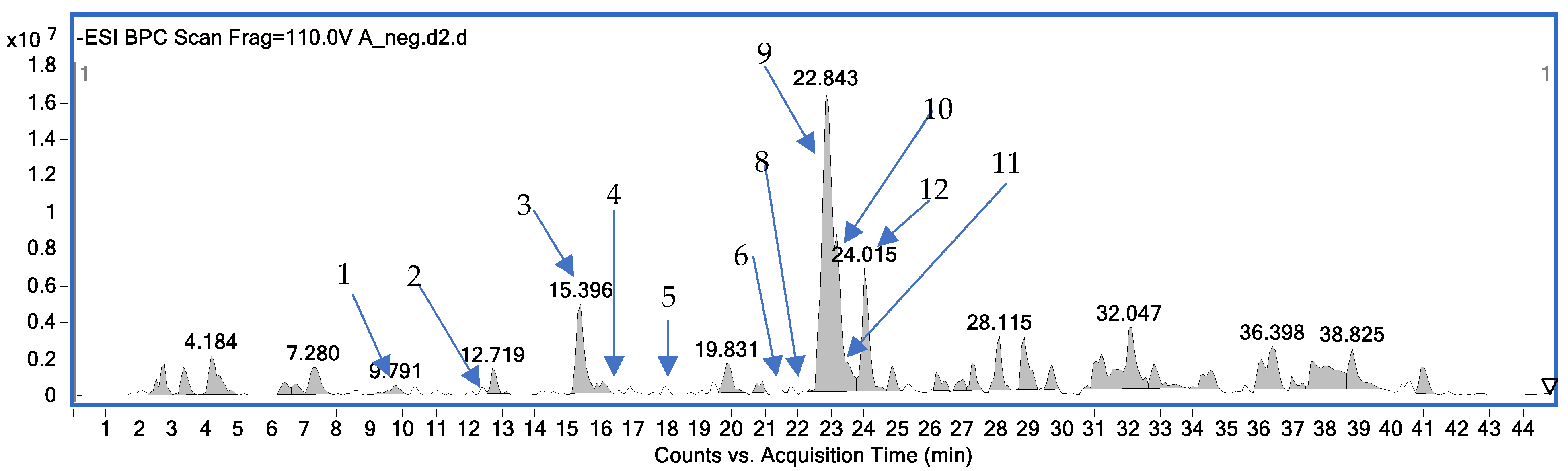 Figure 1 illustrates the chromatogram recorded in the negative mode of the LC-MS analysis of the