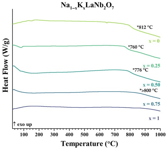 DSC data of the Na1−xKxLaNb2O7 (0 ≤ x ≤ 1) series from room temperature to 1000 °C at a heating rate of 5 °C/min under Ar atmosphere. Decomposition temperatures (*) are shown for x = 0. 0.25, 0.50, and 0.75. Small low temperature endotherms (<200 °C, x = 0, 0.25) are due to the loss of water of hydration [] and the endotherm at 680 °C (x = 0) has been attributed to a structure change in the perovskite layer [].