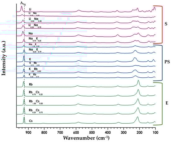 Stack plot of Raman data for the series A1−xA′xLaNb2O7 (A/A′ = Li, Na, K, Rb, Cs; 0 ≤ x ≤ 1). Spectra colors vary with layer orientation: green (E), blue (PS), and red (S). Dashed line highlights the blue shift in the A1g vibration for the smaller alkali cations (see Table S3).