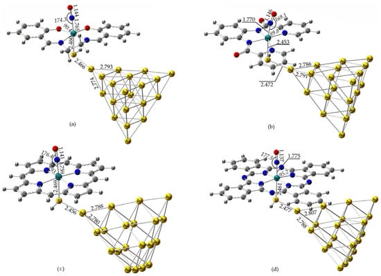 As shown in Figure 1, the nearly linear Ru–N–O bond angles (169–178°) observed in these Ru (II) complexes support a formal NO+ assignment, consistent with a {RuNO}6 configuration as defined by the Enemark–Feltham notation. This is further corroborated by the relatively short N-O bond lengths, falling in the range 1.137–1.146 Å, usually observed for cationic NO+ coordinated to low-spin d6 Ru (II) complexes [36,37]. Figure S1 in the Supplementary Materials presents the simulated IR spectra of the Ru (II) nitrosyl complexes studied. The most intense absorption band, observed in the 1970–2020 cm−1 region, is attributed to the symmetric stretching vibration of the N–O bond Vs(N–O) of the nitrosyl ligand. This feature is characteristic of a linearly coordinated NO+ moiety, indicative of strong N–O multiple bonding. We note that metal–nitrosyl Vs(N–O) stretching frequencies, unlike organic nitroso N–O stretches, typically appear in the 1800–2100 cm−1 region due to the linear Ru–NO+ bonding motif and strong π backbonding [36]. Our calculated values (1970–2020 cm−1) are in excellent agreement with these established benchmarks. To further validate this, we performed optimization and vibrational analysis of two benchmark Ru (II) octahedral complexes, i.e., the [(NH3)5Ru(NO)]3+ and the [(CN)5Ru(NO)]2−, employing our computational protocol (PBE0/LanL2DZ(Ru)U6-31G(d,p)(E)/PCM(Water)). Again, the νs(N–O) stretching frequencies were found at 2089 and 1905 cm−1 for the [(NH3)5Ru(NO)]3+ and the [(CN)5Ru(NO)]2− complexes, respectively, in very good agreement with previously reported results [36]. Due to the large size of the Ru–NO–Au20 hybrid complexes and the well-localized character of the νs(N–O) mode, a full Potential Energy Distribution (PED) analysis was not performed. The assignment of the nitrosyl stretching vibration is unambiguous and consistent with benchmark Ru–NO systems and established experimental ranges (ca. 1850–2100 cm−1).