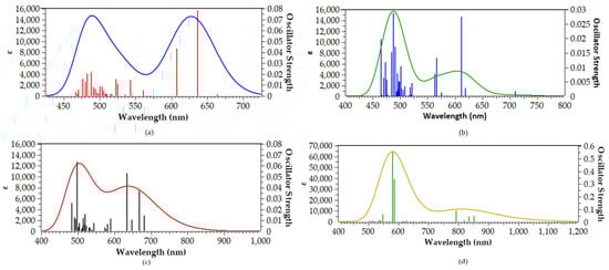 Simulated absorption spectra of (a) [(Salen)Ru(NO)(SH)], (b) [(bpb)Ru(NO)(SH)], (c) [(Porph)Ru(NO)(SH)], and (d) [(Pc)Ru(NO)(SH)] calculated at the PBE0/LANL2DZ(Ru)U6-31G(d,p)(E) level in water solvent (fitted with a Gaussian function broadening with full width at half-maximum (FWHM) equal to 0.2 eV or ≈30–50 nm).