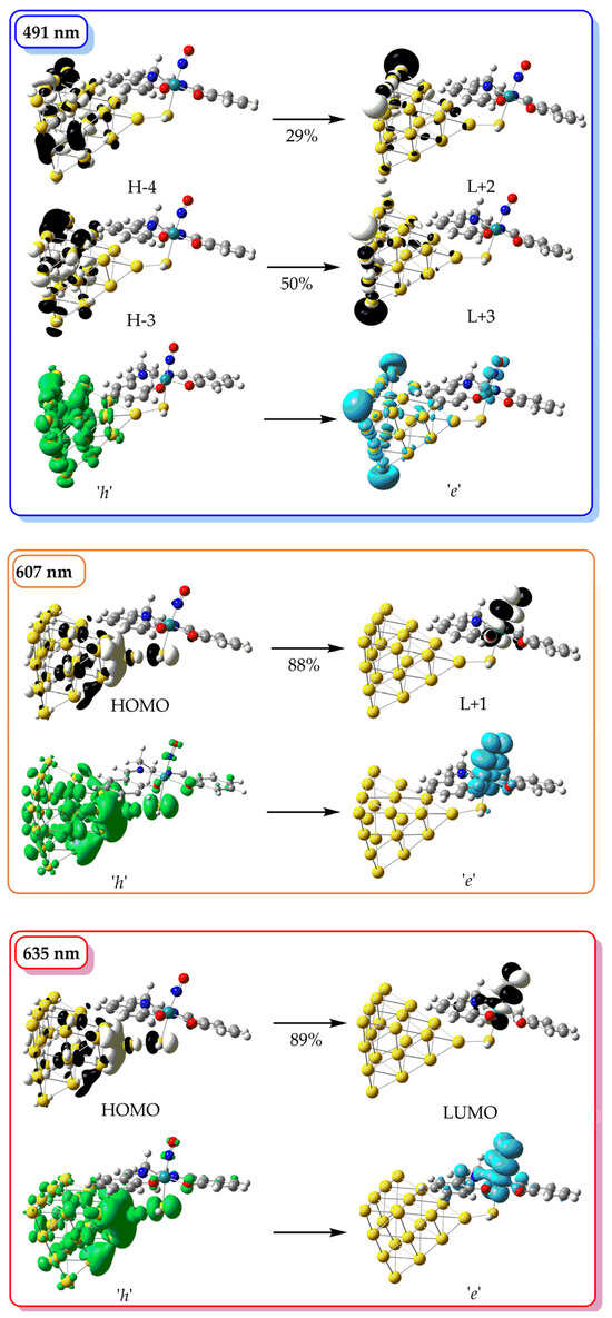 The 3D surfaces of MOs relevant to the most important electronic transitions in the simulated absorption spectra of [(Salen)Ru(NO)(SH)@Au20], along with the respective hole (h, green surface) and electron (e, light blue surface) distributions.