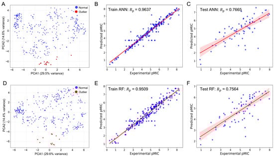 Predicted versus experimental pMIC following PCA-guided outlier curation. (A) PCA of MACCS fingerprints highlighting outliers used for curation. (B) MACCS-based ANN, training set (Rp = 0.9637). (C) MACCS-based ANN, test set (Rp = 7665). (D) PCA of PubChem descriptors highlighting outliers used for curation. (E) PubChem–based RF, training set (Rp = 0.9509). (F) PubChem–based RF, test set (Rp = 0.7564). Blue markers denote individual compounds; red lines indicate least-squares regressions with 95% confidence intervals. All models were optimized via grid search under a consistent 10-fold cross-validation scheme.